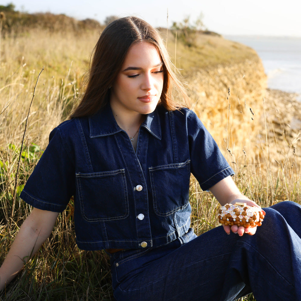 The Clutch Edge Airpod Wood is a high-quality artisanal creation featuring a highly custom brass octagonal shape frame and an entirely handcrafted crystal and natural wood body. Each piece is meticulously handcrafted over a period of 8 hours, reflecting the excellence of Italian craftsmanship and attention to detail.